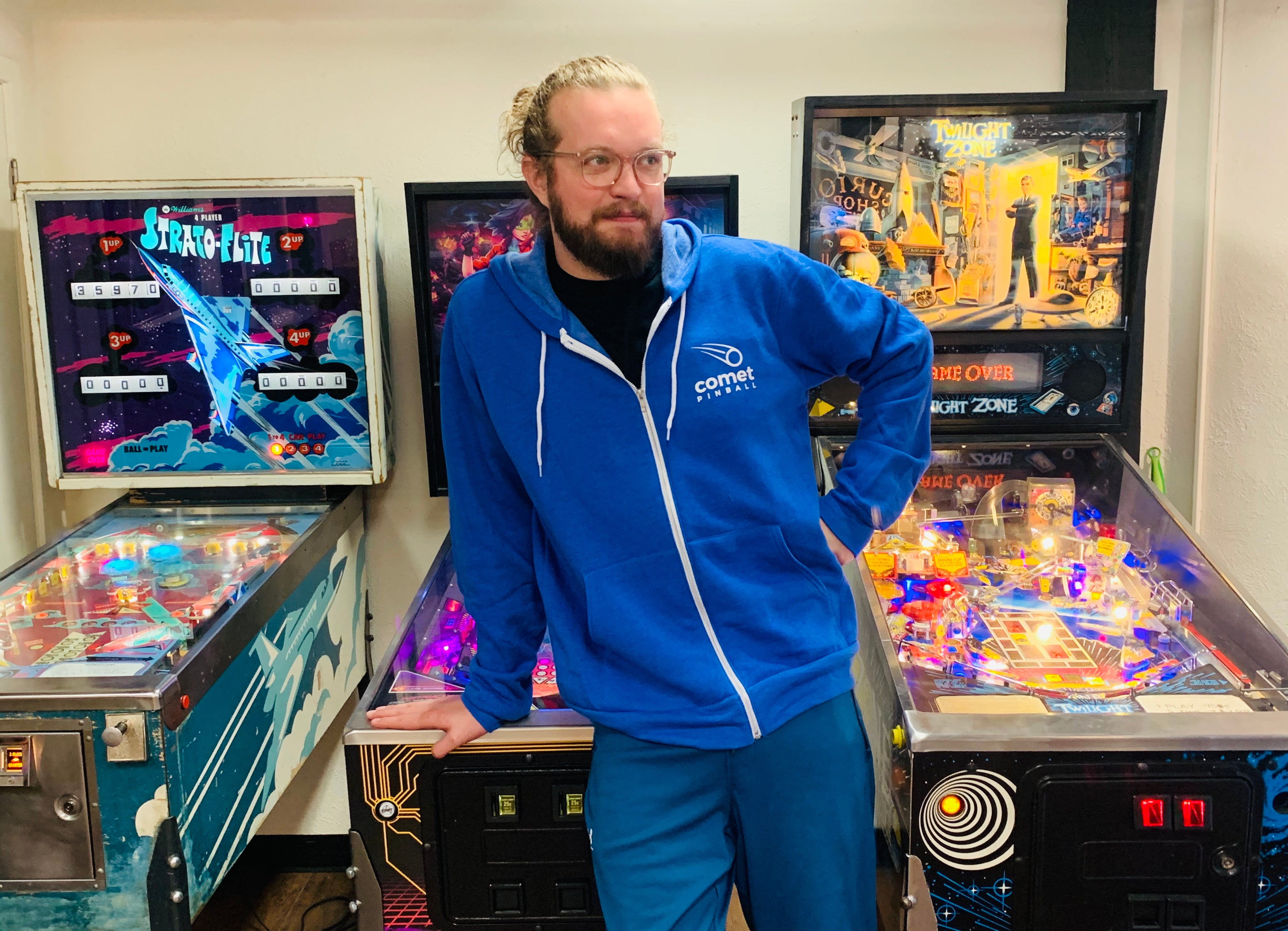 Feeling cold? Put your hands in the pockets and bring that hood up over your head. The ultimate companion to the cold AC of pinball at convention centers.